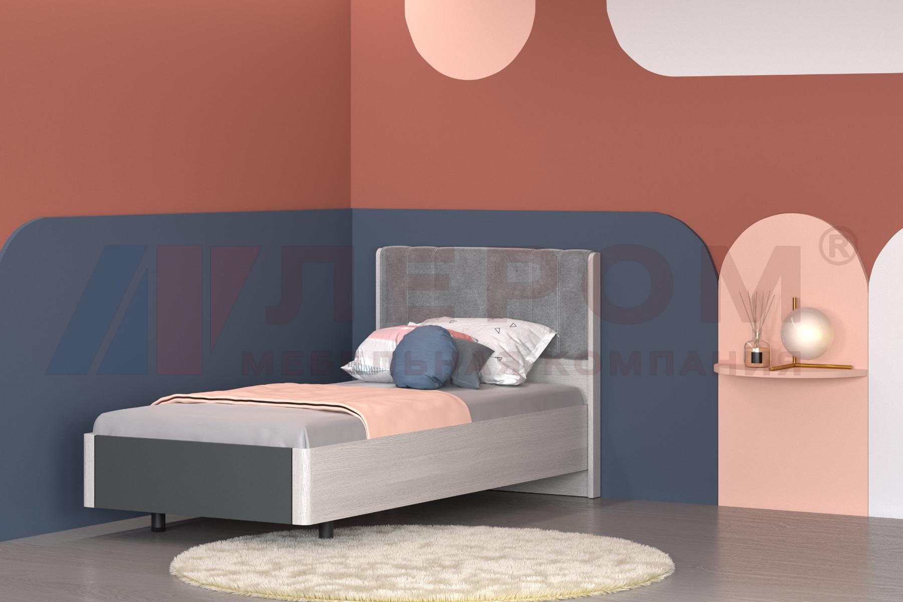 — корпус Ясень Асахи, вставка в изголовье Велюр серый и изножье Антрацит Матовый (АС-АМ);