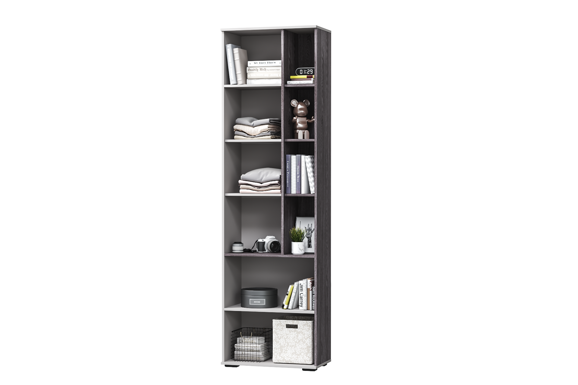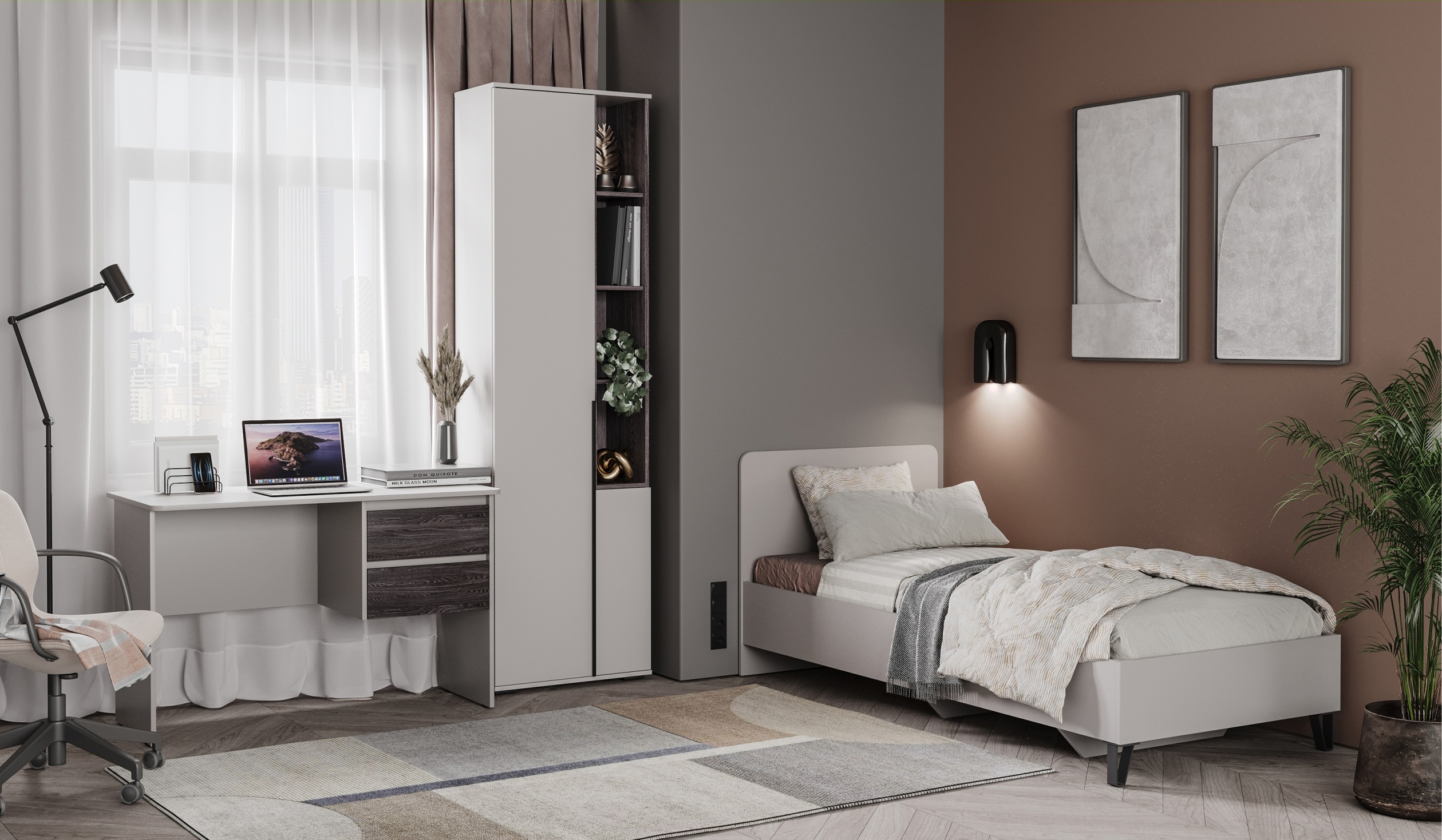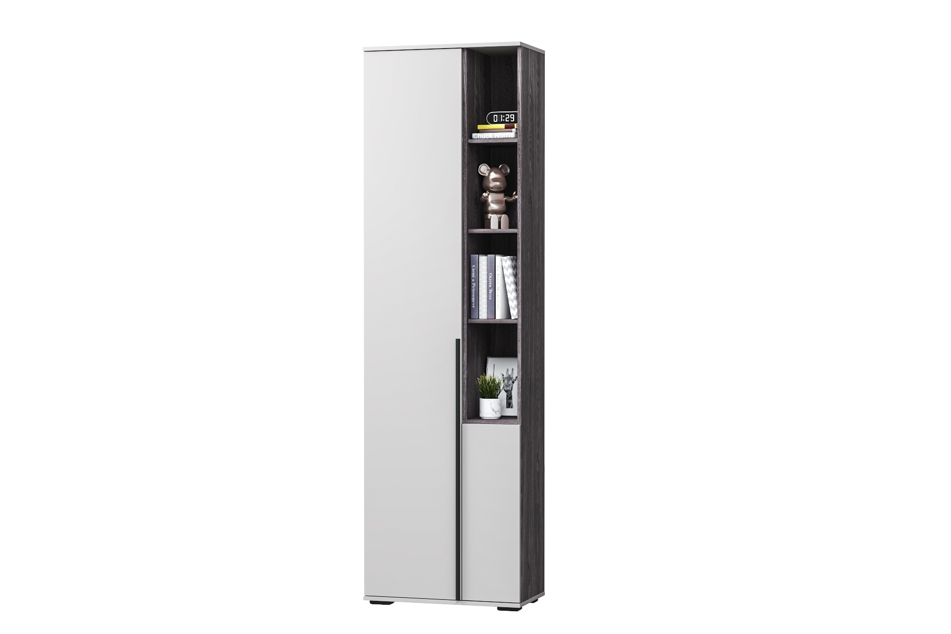 Шкаф-пенал с полками подростковой серии Наоми представлен в элегантном сочетании цветов «кашемир» и «черный ясень», что делает его универсальным элементом для любого интерьера.