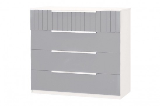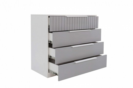 Вместительный комод с 4 ящиками с усиленными направляющими, металлическими ручками и фасадами из МДФ с фрезеровкой.