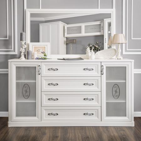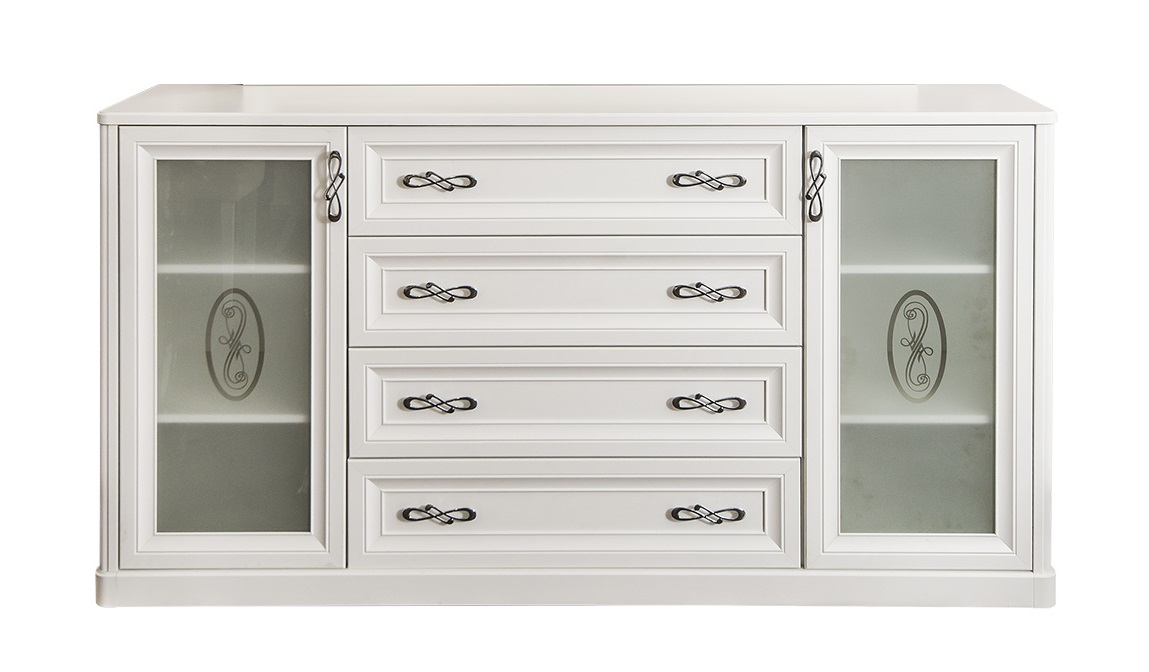 Комод Мишель — габаритный комбинированный комод с четырьмя центральными выдвижными ящиками и крайними отделениями с двумя полками из ЛДСП за застекленными распашными дверцами. Стекло дверец декорировано медальоном, выполненным пескоструйным методом.
