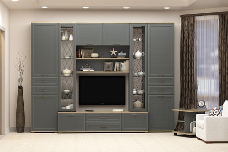 Фасад имеет уникальное сочетание глубокого тиснения и эффекта патины, присущей классическому стилю. Изящество фасада подчеркивает стекло с алмазной гравировкой и фацетом.