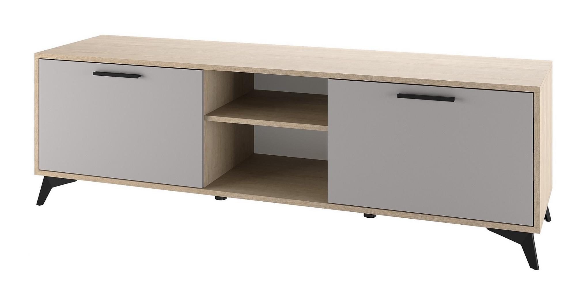 Тумба 1600 2С Ева с откидными створками на газлифтах. Фасады, крышка и лицевой периметр тумбы обработаны кромкой 1 мм. Чёрные металлические ручки и ножки-опоры.