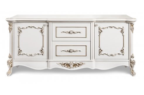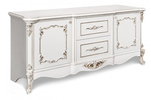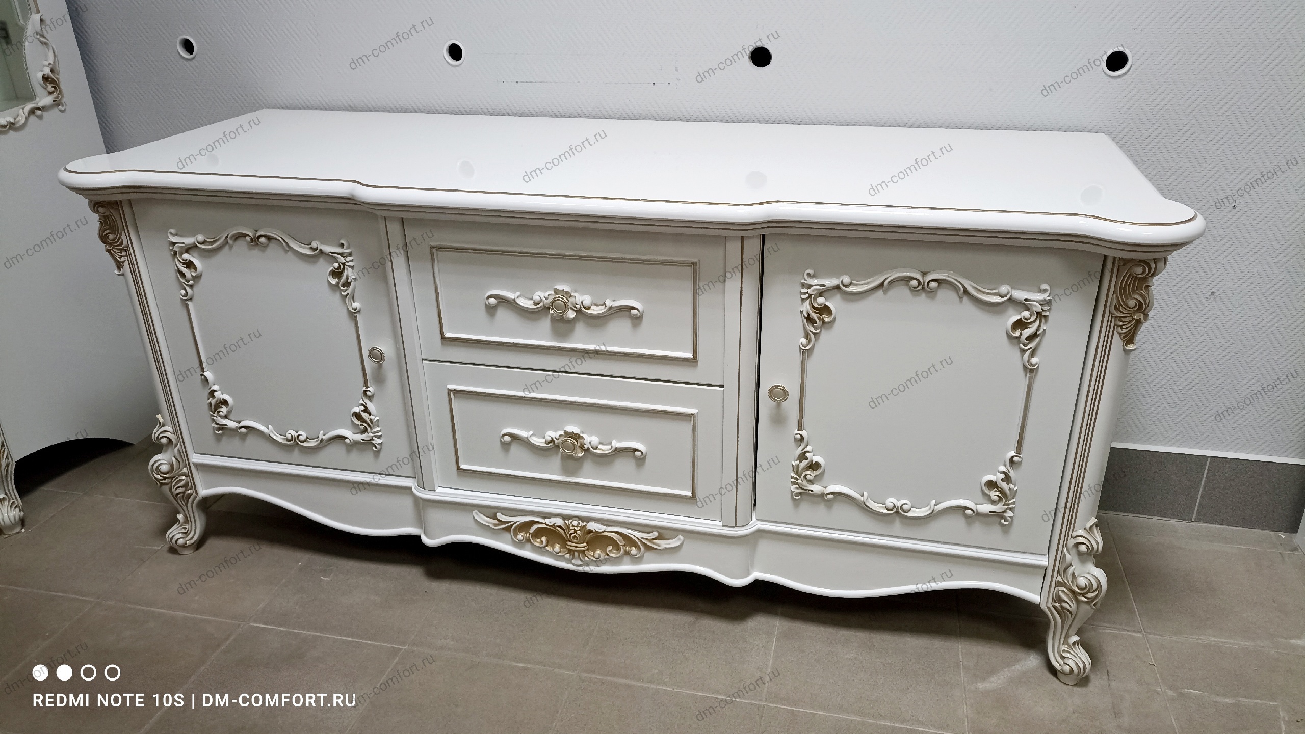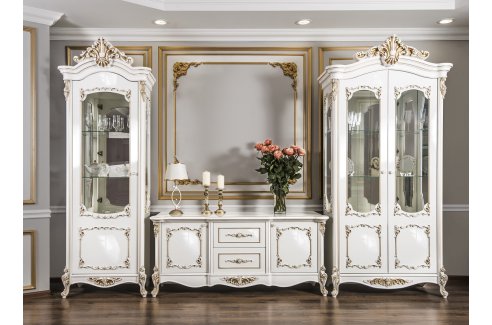 Ящики и дверцы украшены прочной фурнитурой, которая отличается длительным сроком эксплуатации. Фасады мебели украшены изящной резьбой с золотистым покрытием.