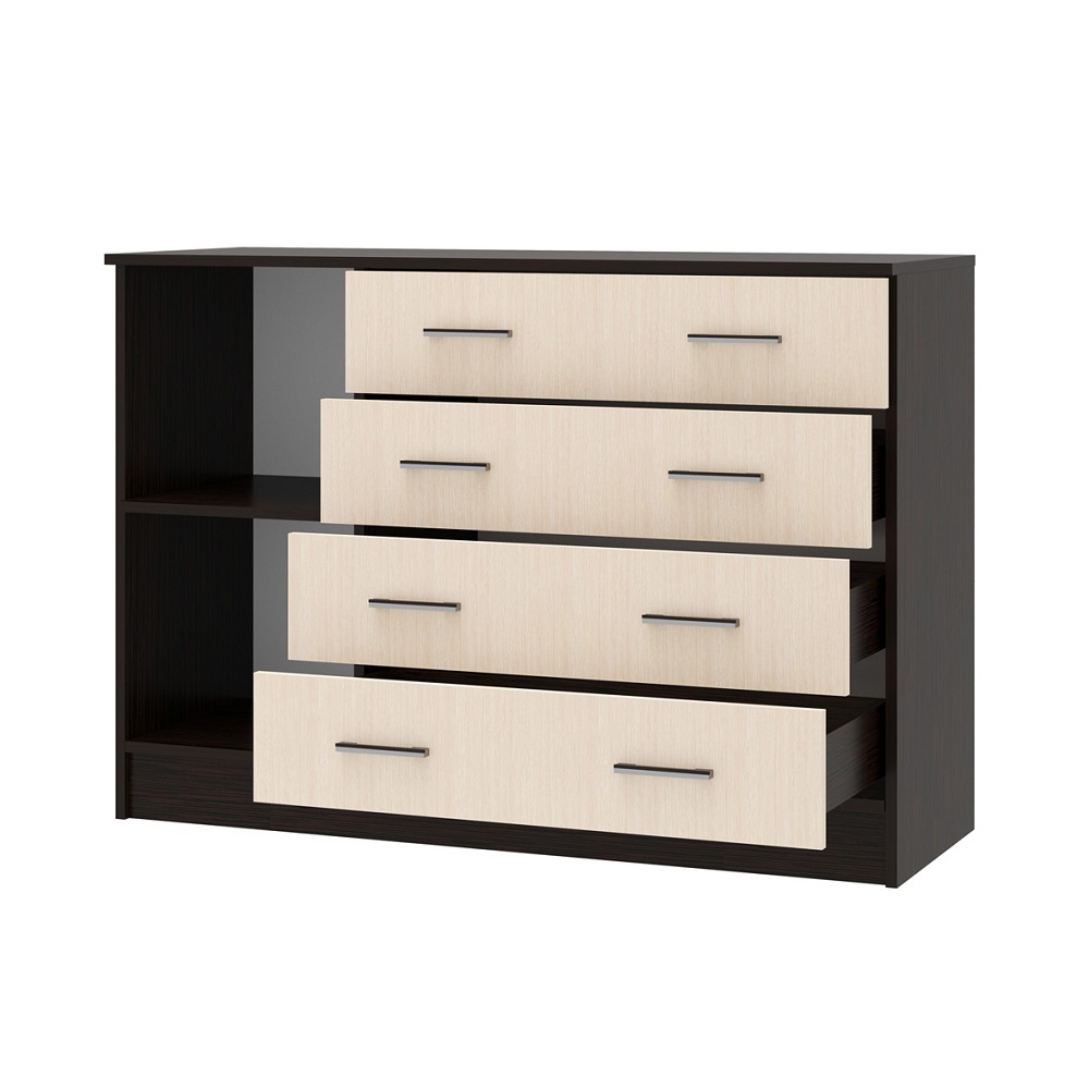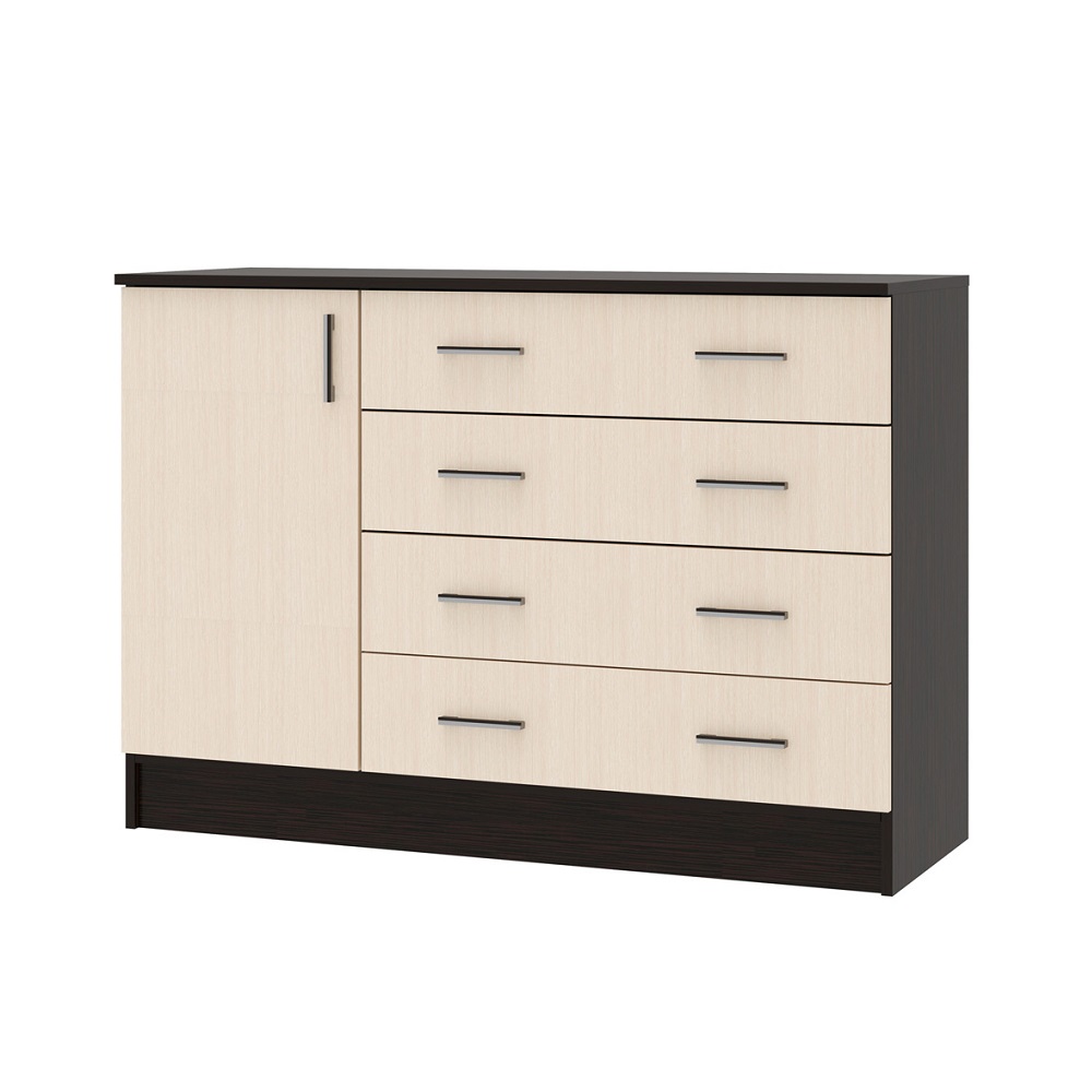 Современный комод София оснащен четырьмя вместительными ящиками и одной дверцей.