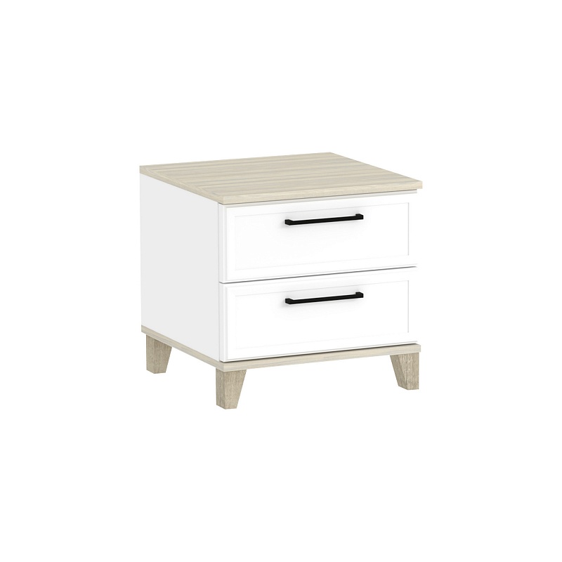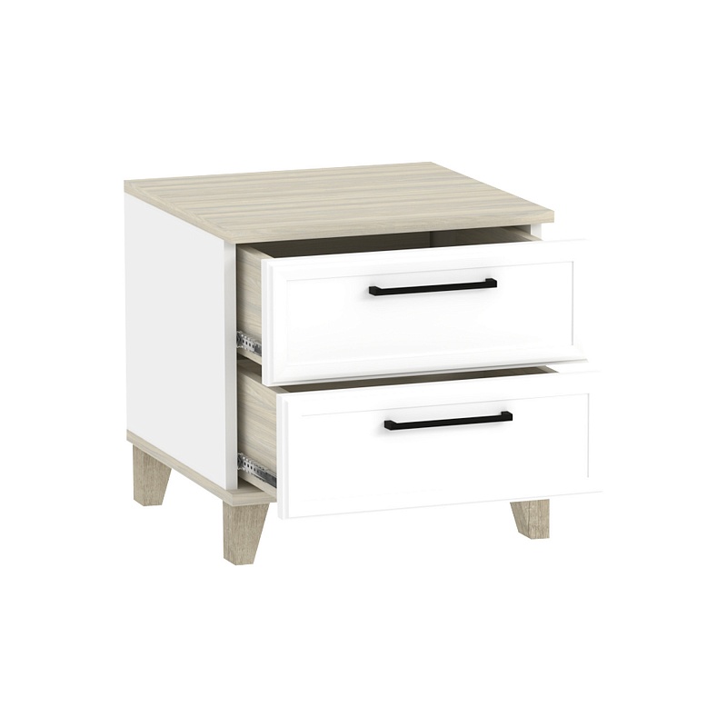 Прикроватная тумба AURELIO 41 с двумя выдвижными ящиками, обрамлёнными тонким фигурным профилем – красивый и функциональный модуль. Ящики тумбы на шариковых направляющих. Основательные опоры из МДФ не деформимуются со временем. Дополняют тумбу чёрные металлические ручки на ящиках. Донья ящиков в древесном декоре придают мебели коллекции Aurelio дополнительную эстетику.