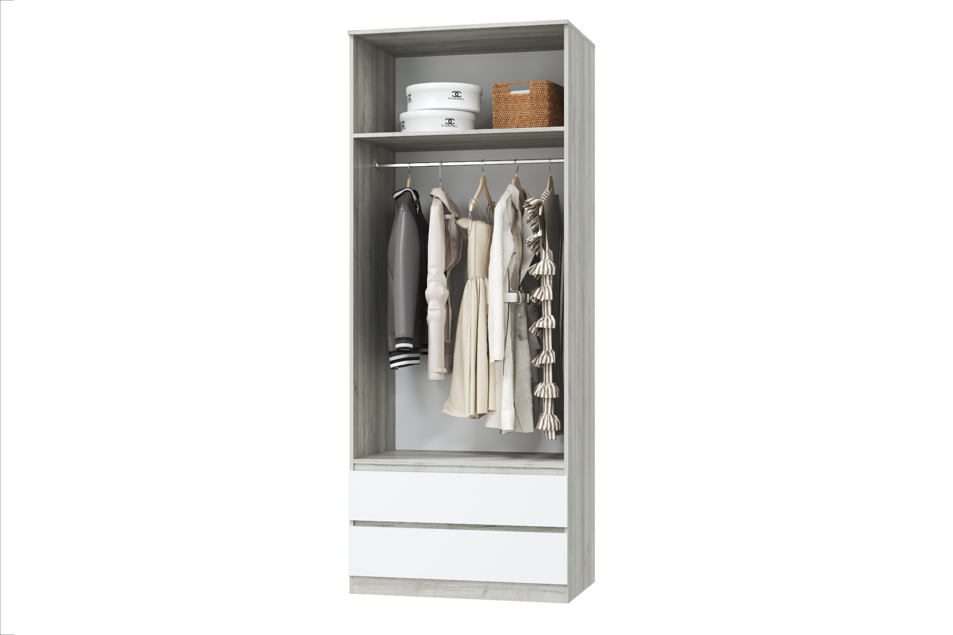 Шкаф многоцелевой 2-х дверный Лори с ящиками, станет гармоничным дополнением общего интерьера любой комнаты. За распашными дверьми находится широкая штанга для вешалок-плечиков, а антресольная и два выдвижных ящика пригодятся для сложенной одежды, белья, обуви и различных аксессуаров.
