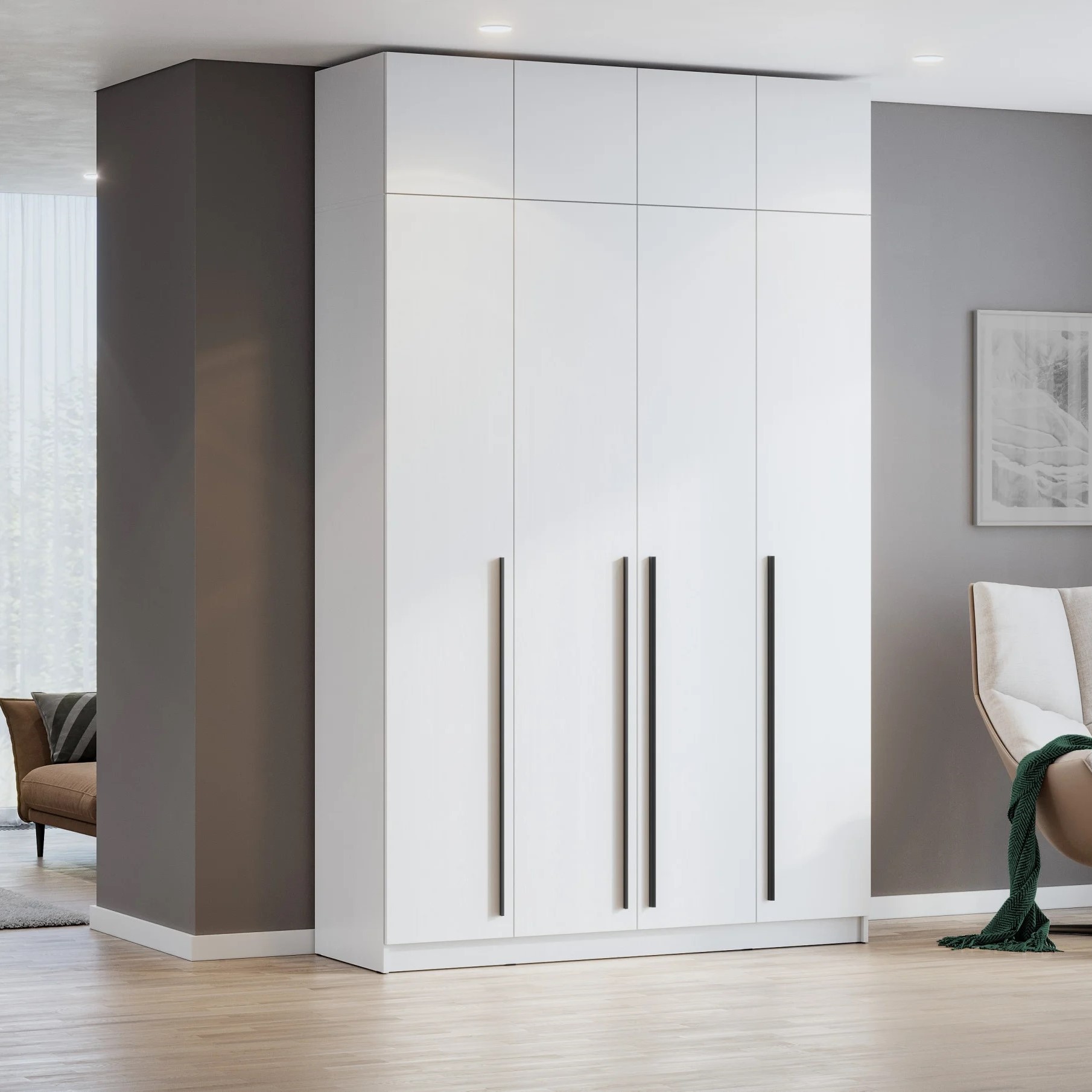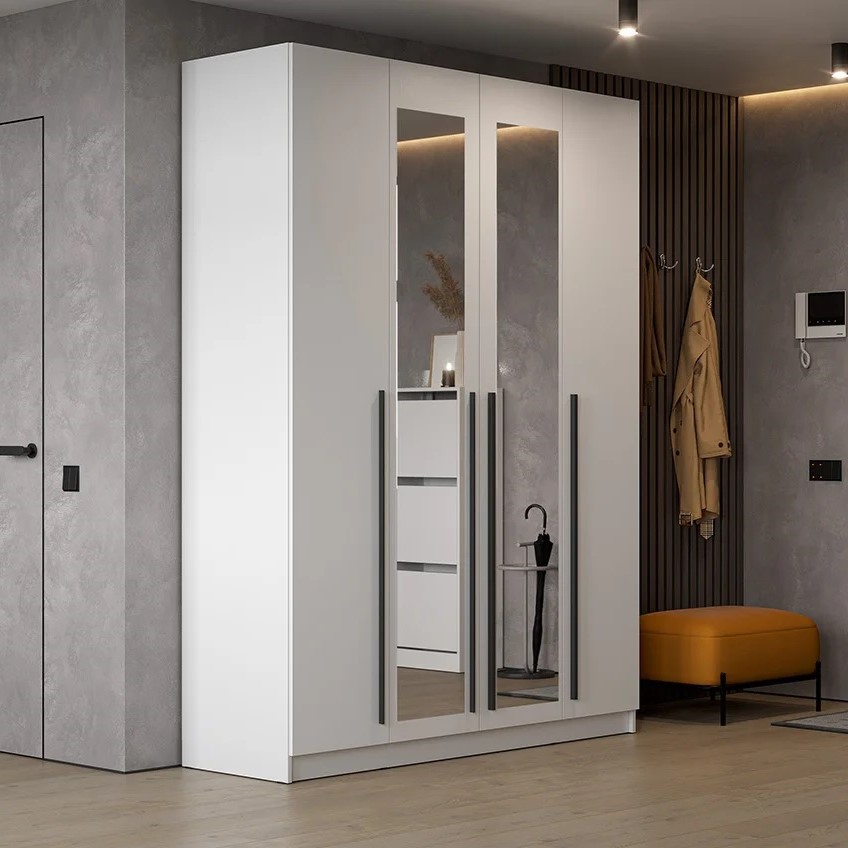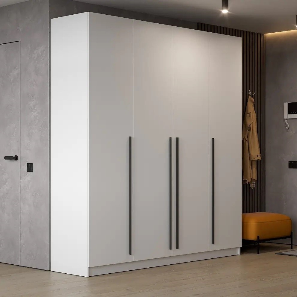 Шкаф 4дв. Берген — идеальное сочетание функциональности и стиля. Минимализм, выраженный в строгих линиях, нейтральных оттенках и идеальных пропорциях, делает его универсальным решением для любого интерьера.