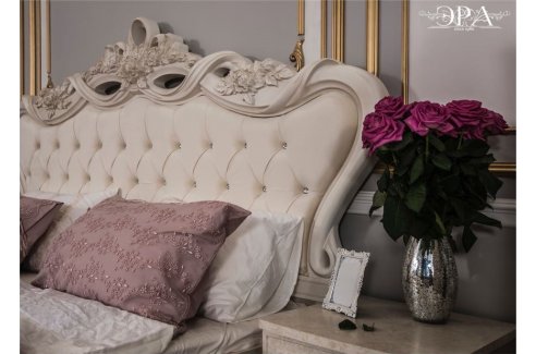Кровать с мягким изголовьем Афина — комфортная двуспальная кровать с роскошным мягким фигурным изголовьем, декорированным каретной стяжкой и объемным резным обрамлением. Кровать выполнена без изножья с основательными опорами, декорированными лаконичной резьбой. Кровать со спальным местом размером 160х200 см оснащена деревянным основанием с ламелями.