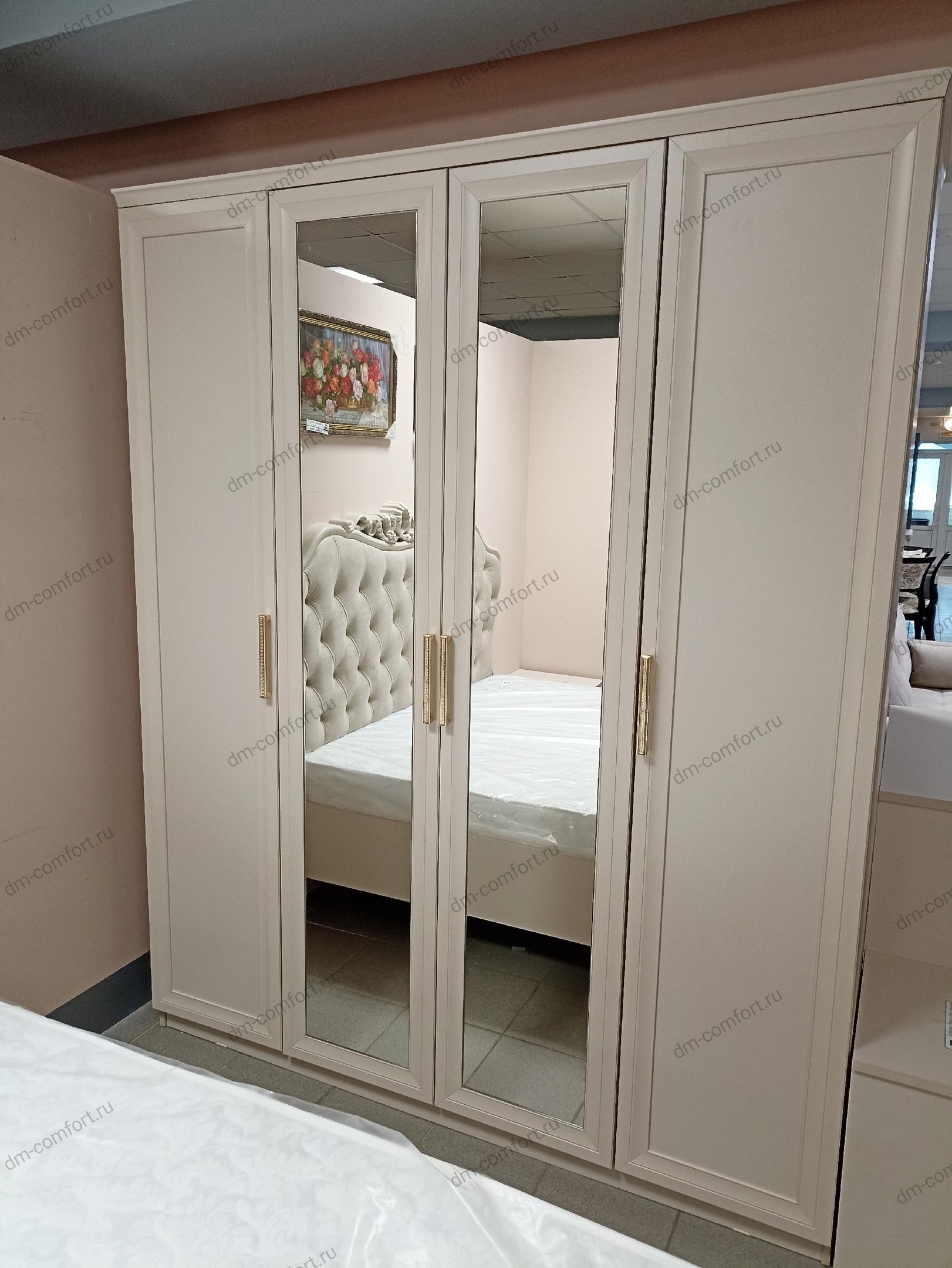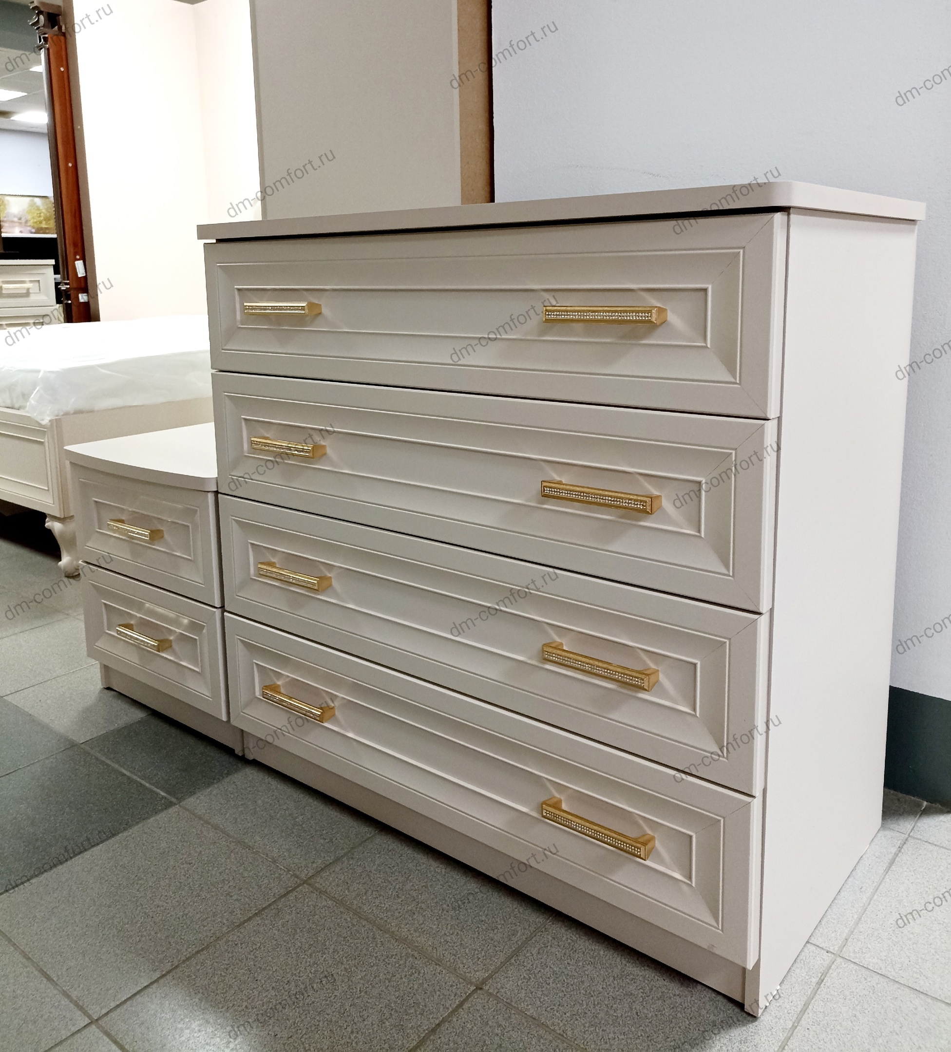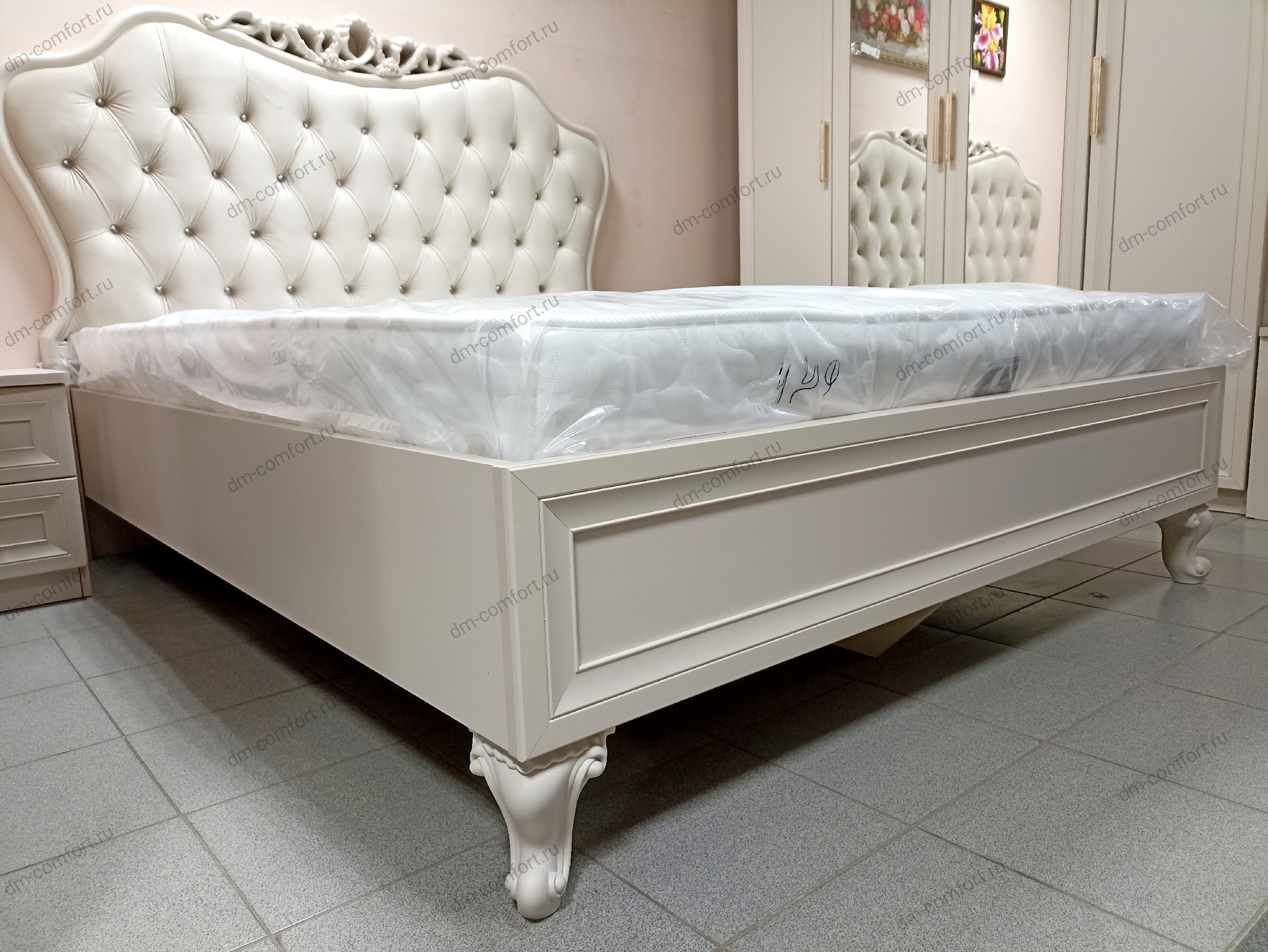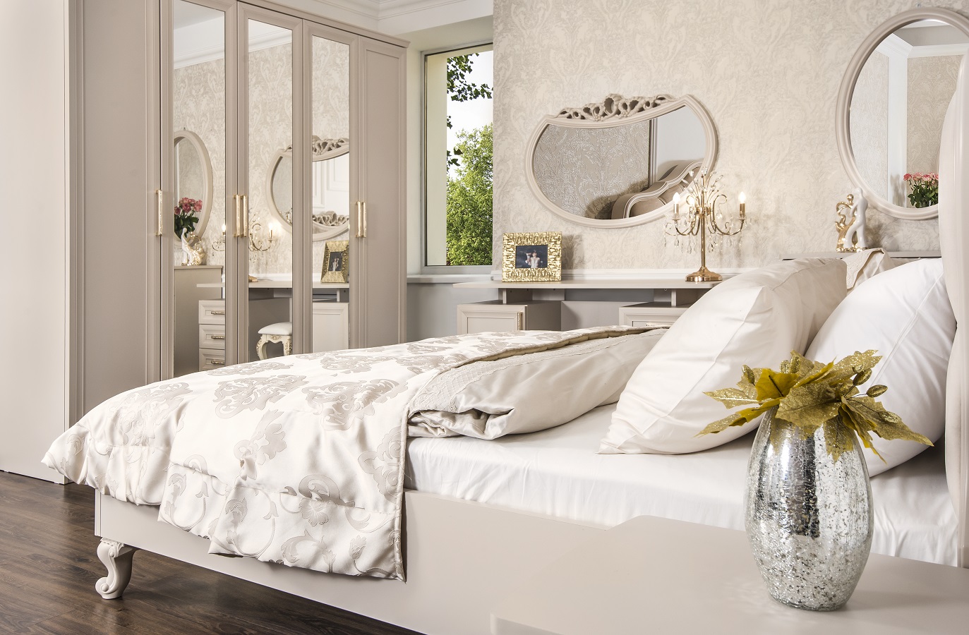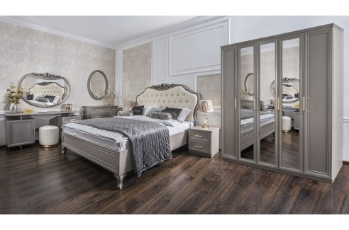 Спальный гарнитур Мокко комплект-2, цвет: бежевый — прекрасный комплект современной классической мебели для спальни: роскошная двуспальная кровать, элегантный шкаф с зеркалами, прикроватные тумбы, туалетный столик, зеркало ППУ. Кровать оснащена основанием с ламелями, основание модулей цокольное, на фасадах оригинальные ручки со стразами.