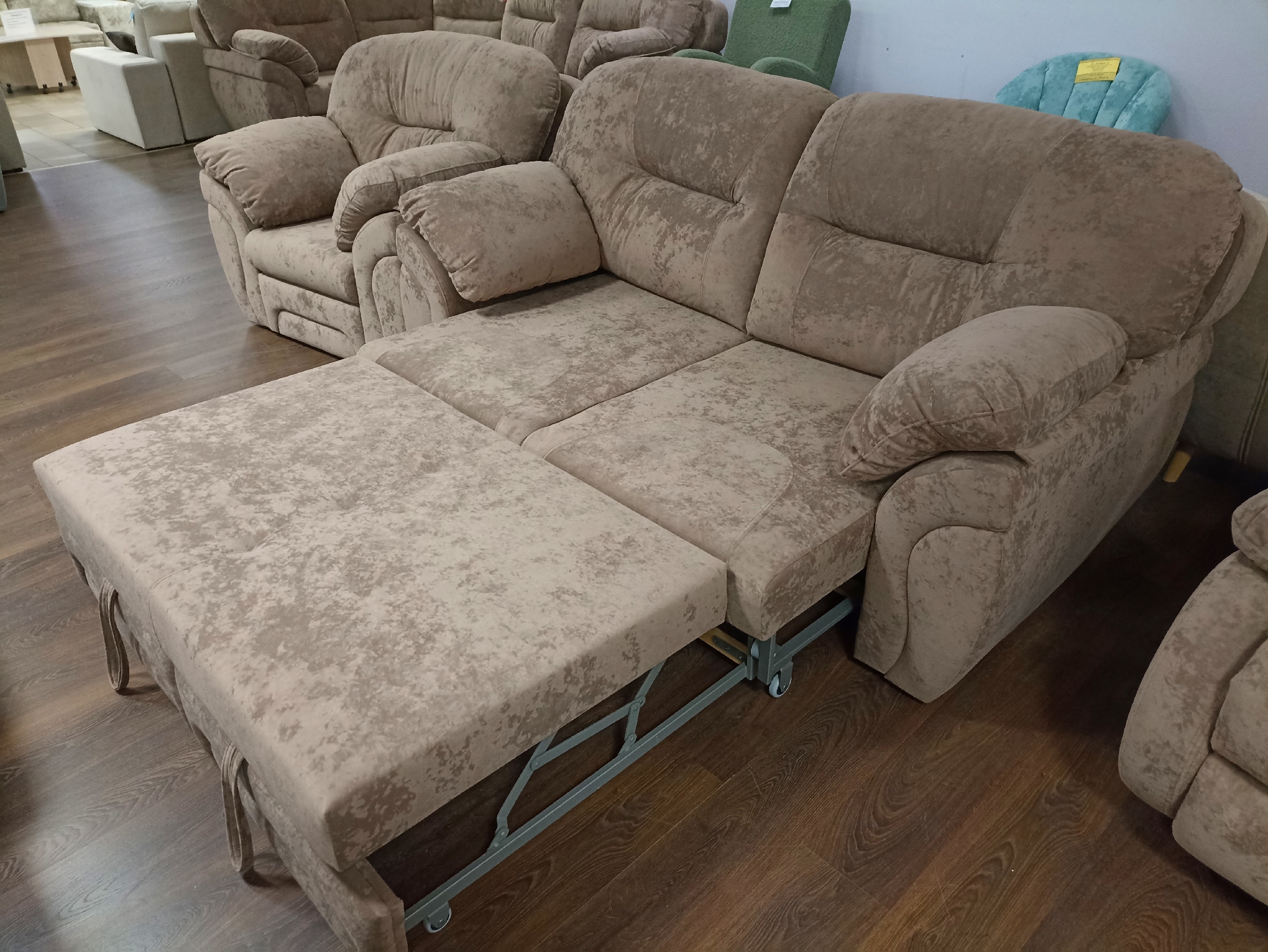 В данной модели дивана используется выкатной механизм, при раскладке получается удобное спальное место, размером 1900*1400 мм.
